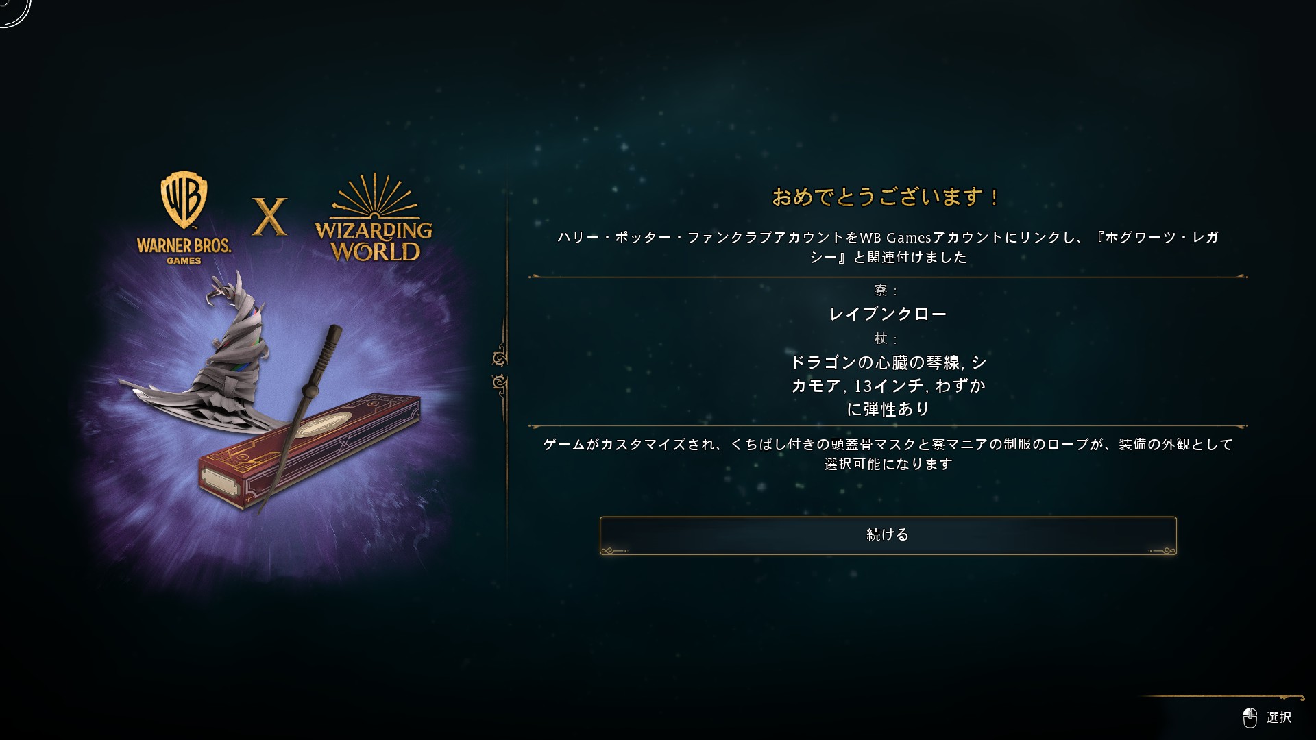 もちろんゲーム内でも簡単な質問はありますし、なんなら自分で選ぶことができますが、ファンであるならばハリー・ポッターの世界への没入感を高めるためにも、公式ファンクラブとの連携を強く推奨します。